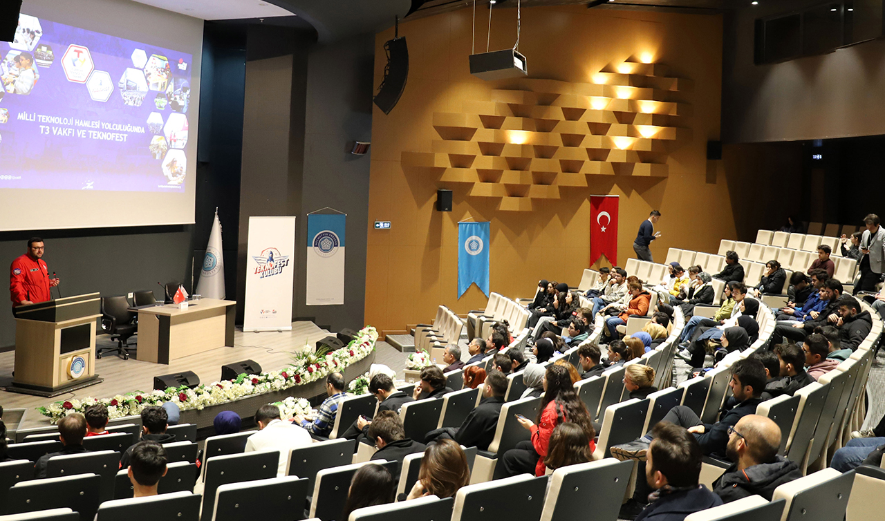 NEÜ Mühendislik Fakültesi Konferans Salonu’nda T3 Vakfı Konya İl Sorumlusu Uğur Çakır’ın konuşmacı olarak yer aldığı programa; NEÜ Rektör Yardımcısı Prof. Dr. Hidayet Oğuz, NEÜ Mühendislik Fakültesi Dekanı Prof. Dr. Süleyman Savaş Durduran, NEÜ Havacılık ve Uzay Bilimleri Fakültesi Dekanı Prof. Dr. Murat Dilmeç, NEÜ TEKNOFEST takımları koordinatörü Dr. Öğr. Üyesi Hasan Hüseyin Bilgiç, akademisyenler ve öğrenciler katıldı.