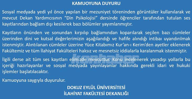 Olayın gündem haline gelmesi üzerine Dokuz Eylül Üniversitesi (DEÜ) İlahiyat Fakültesi Dekanlığı da bir açıklama yaptı. Açıklamada, ilgili ses kaydının bağlamından koparılarak yayınlandığı belirtilip konuyla ilgili yasal işlem başlatılacağı duyuruldu.