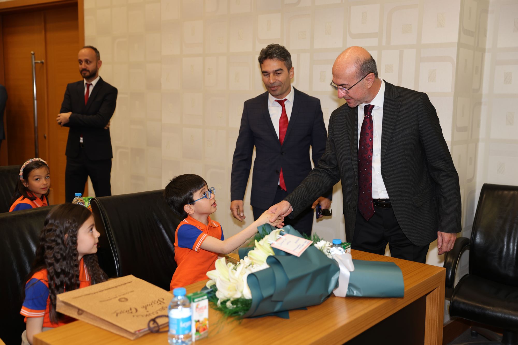 Ziyarete gelen öğrenciler Selçuklu Belediye Başkanı Ahmet Pekyatırmacı’ya çiçek takdim etti. Keyifli bir sohbetin sonunda öğrenciler ile hatıra fotoğrafı çekinen Başkan Pekyatırmacı, ziyaretin anısına öğrencilere hediye takdiminde bulundu. (Veli Şengül)