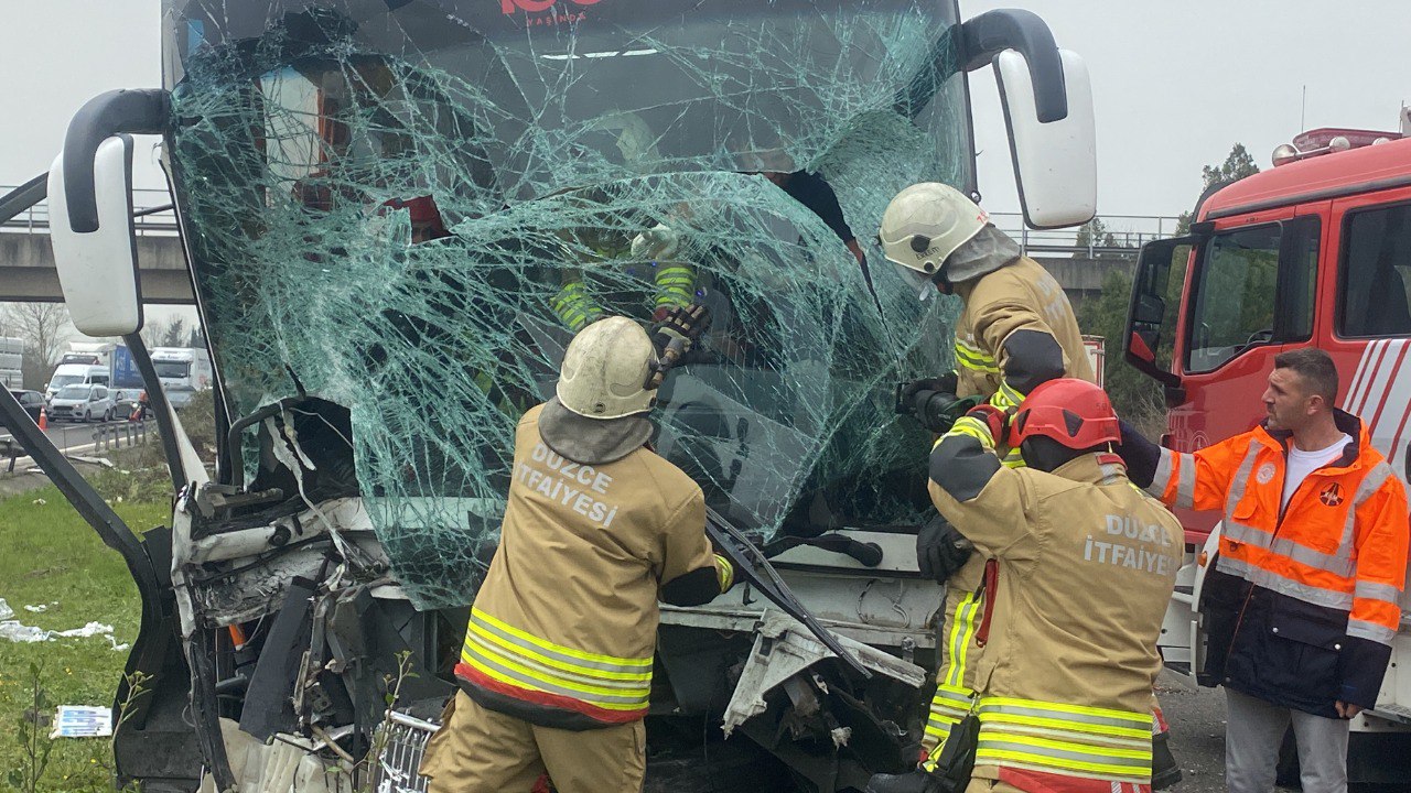 Kazada otobüste sıkışan muavin E.P. itfaiye erlerince bulunduğu yerden çıkarıldı.