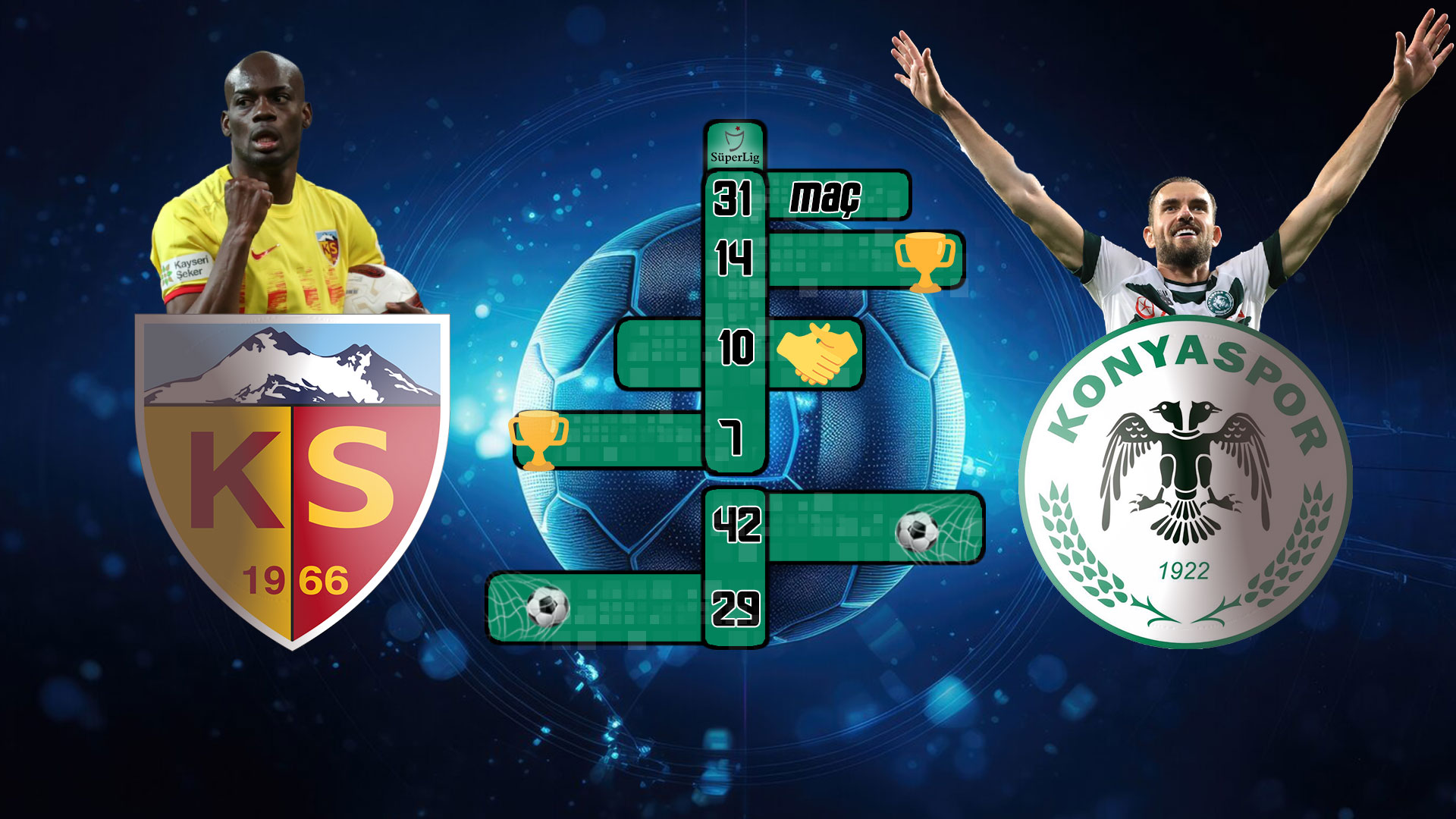 Konyaspor ile Kayserispor, Süper Lig nezdinde birbirlerine karşı 31 kez rakip oldu. Bu karşılaşmalardan 14’ünü Konyaspor, 7’sini ise Kayserispor kazandı. Arda kalan 10 karşılaşmada ise eşitlik bozulmadı. Anadolu kartalı rakibine karşı 42 kez gol sevinci yaşarken, kalesinde ise 29 gol gördü.