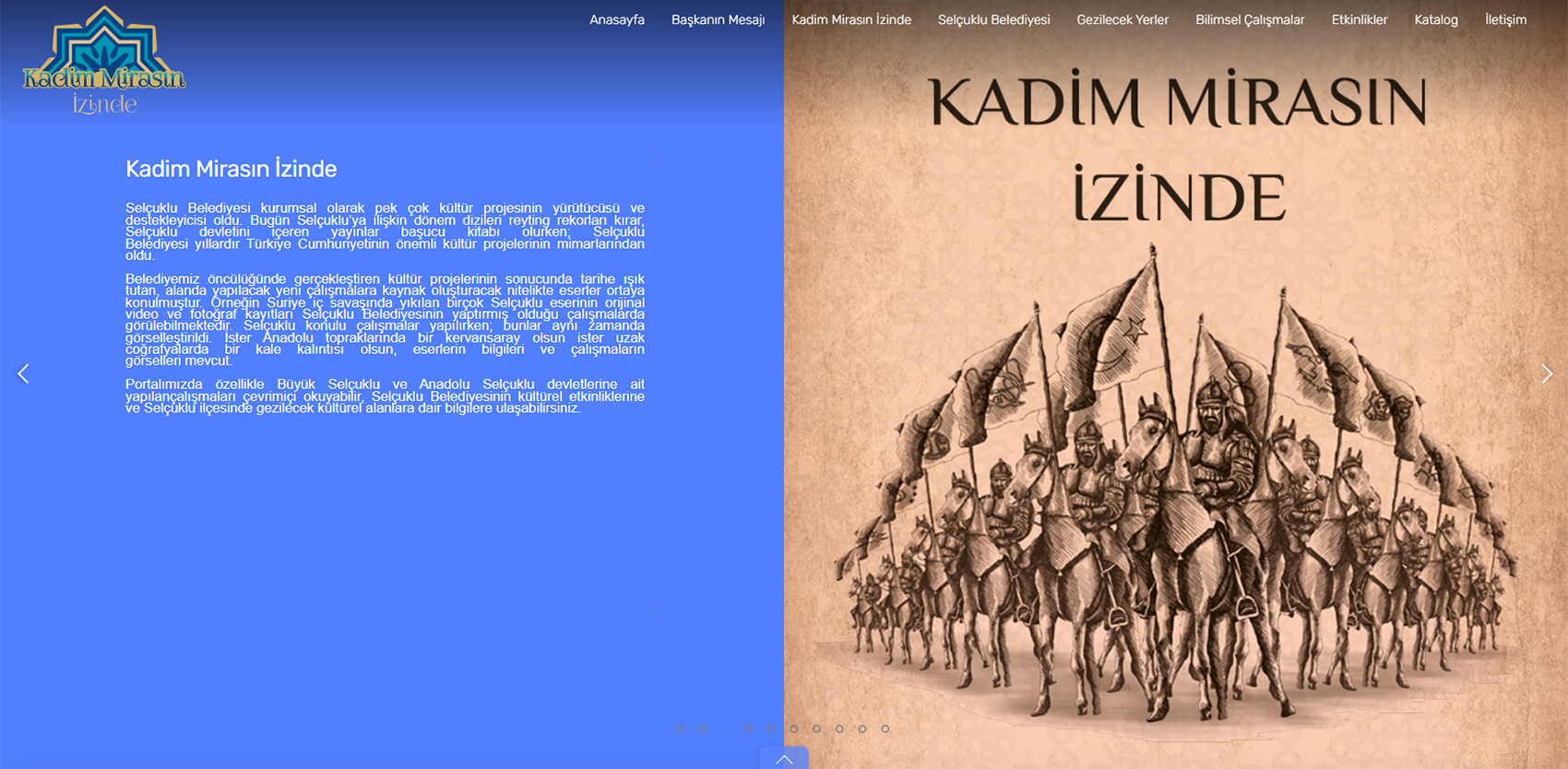 Selçuklu Belediyesi tarafından kullanıma sunulan web sitesinde tamamı Selçuklu Belediyesi’nce oluşturulan kaynak eserler yer alıyor. Selçuklu medeniyeti ile ilgili en kapsamlı araştırmaların kitaplaştırılarak gelecek nesillere aktarılmasında önemli bir rol oynayacak sitede Selçuklu medeniyetinin kodları yer alıyor. Site içerisinde tarihi ve kültürel mirasın pekiştirilmesi için bugüne kadar Selçuklu Belediyesi tarafından düzenlenen etkinlikler, yarışmalar, sergiler de bulunuyor. Selçuklu’yu anlamak ve bu medeniyetin izlerini yerinde görerek yakından tanımak isteyenler için bir rehber özelliği taşıyan site Selçuklu’da ziyaret edilecek yerlerle ilgili de ayrıntılı bir şekilde bilgi veriyor.