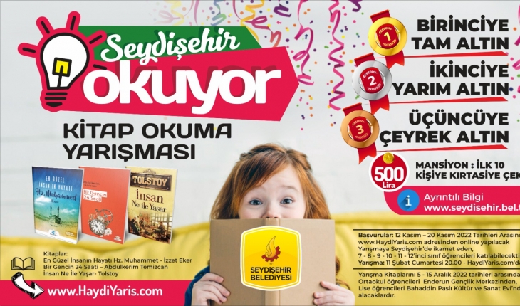 Belediyeden yapılan yazılı açıklamada, kitap okuma yarışmasına www.haydiyaris.com adresi üzerinden kaydolan lise öğrencilerinin yarışma kitaplarını 5-15 Aralık'ta Bahaddin Paslı Kültür ve Sanat Evinden, ortaokul öğrencilerinin ise Enderun Gençlik Merkezinden ücretsiz olarak temin edebileceği belirtildi.