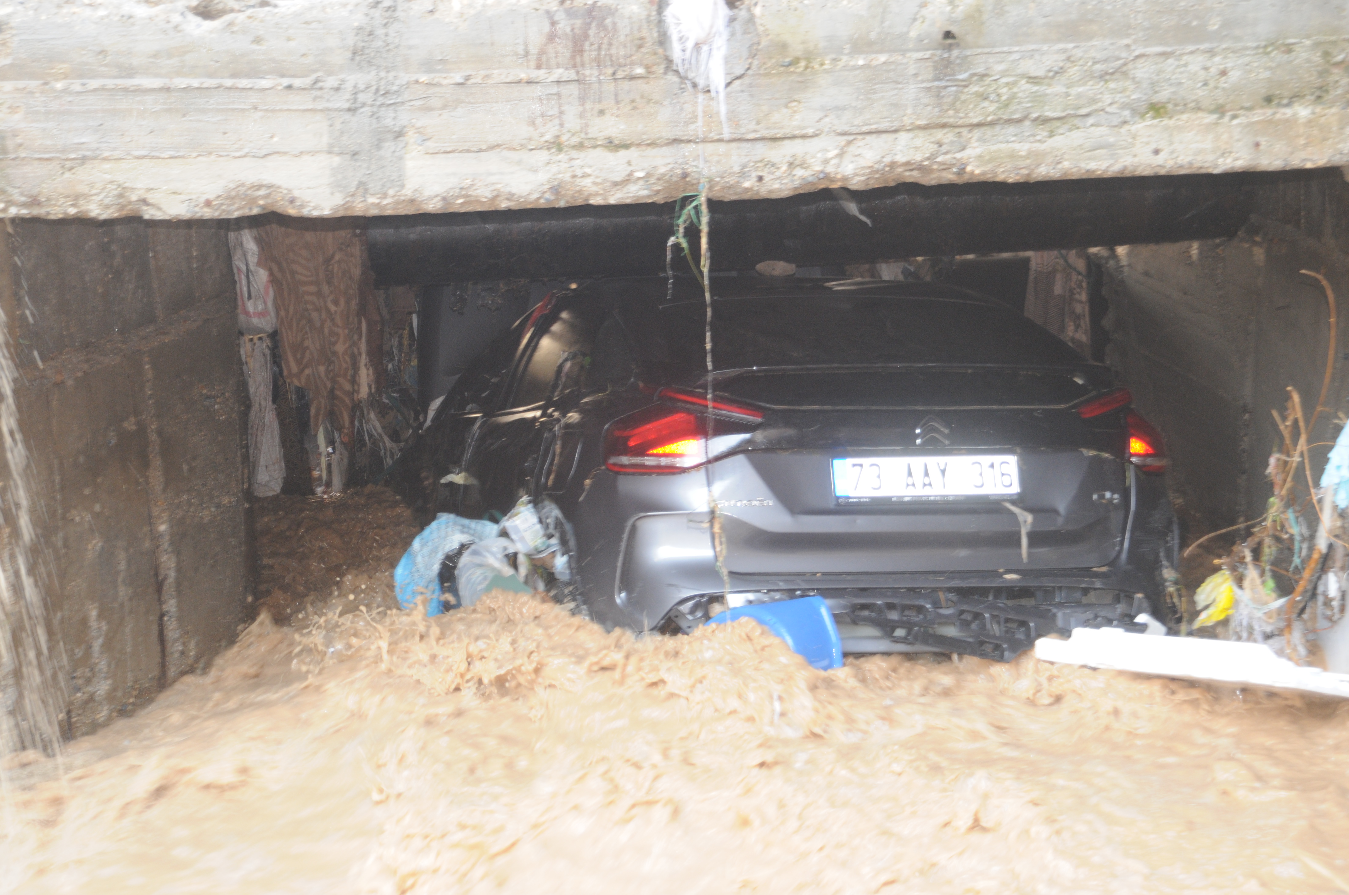Nur Mahallesi'nde suya kapılıp sürüklenen park halindeki otomobil menfezde sıkıştı.