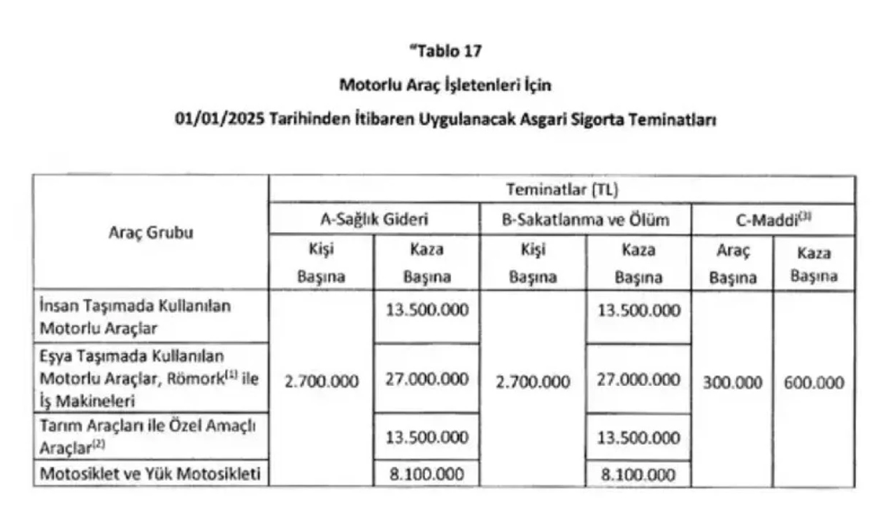 Motorlu Araç Sahipleri için araç başına maddi giderler 200 bin liradan 300 bine, kaza başına ise 400 bin liradan 600 bin liraya yükseltildi. Kişi başına sağlık giderleri 1.8 milyon liradan 2.7 milyon liraya, kaza başına sağlık giderleri 9 milyon liradan 13.5 milyon liraya yükseldi. Sakatlanma ve ölümde kişi başına tutar 1.8 milyon liradan 2.7 milyon liraya, kaza başına ise 9 milyon liradan 13.5 milyon liraya çıktı.