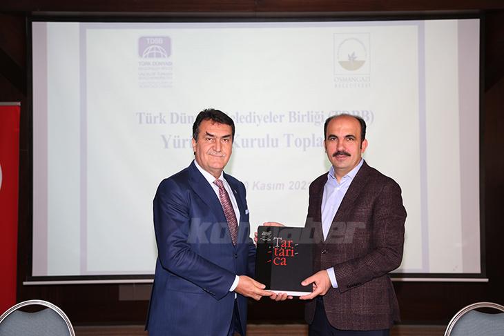 Toplantı sonunda TDBB Başkanı ve Konya Büyükşehir Belediye Başkanı Uğur İbrahim Altay, Osmangazi Belediye Başkanı Mustafa Dündar’a TDBB’nin prestij eserlerinden olan Atlas Tartarika’yı hediye etti.