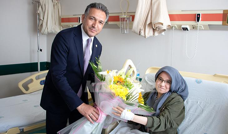 Selçuk Üniversitesi Rektörü Prof. Dr. Metin Aksoy; Rektör Yardımcısı Prof. Dr. İlhan Çiftci ve Selçuk Üniversitesi Tıp Fakültesi Hastanesi Başhekimi Prof. Dr. Mustafa Koplay ile birlikte, tedavisi göğüs cerrahisi servisinde yürütülen Fen Fakültesi Arş. Gör. Tenzile Erbayram’ı ziyaret etti. Geçmiş olsun dileklerini ileten Prof. Dr. Aksoy, “Rabbim şifa versin. En kısa zamanda ailenize, öğrencilerinize kavuşacaksınız. Rabbim; devletimize, milletimize güç, kuvvet versin. Devletimizin ortaya koymuş olduğu adımla Tenzile Erbayram Hocamızı ambulans uçakla Konya’ya getirebildik. Cumhurbaşkanımız Sayın Recep Tayyip Erdoğan’a, Sağlık Bakanlığımıza çok teşekkür ediyorum. Devletimizin gücünü zor zamanlarda, yurt dışında daha çok hissediyoruz. Şimdiden iyi bayramlar diliyorum.” dedi. Arş. Gör. Tenzile Erbayram da Rektör Prof. Dr. Metin Aksoy’a teşekkür etti.