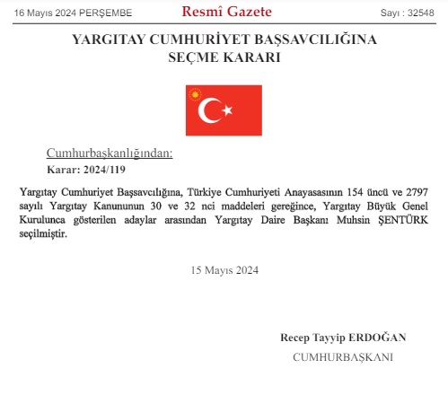 Cumhurbaşkanı Recep Tayyip Erdoğan imzasıyla Resmi Gazete’de yayımlanan kararda, Yargıtay Cumhuriyet Başsavcılığı'na, Türkiye Cumhuriyeti Anayasasının 154 üncü ve 2797 sayılı Yargıtay Kanununun 30 ve 32’nci maddeleri gereğince, Yargıtay Büyük Genel Kurulunca gösterilen adaylar arasından Yargıtay Daire Başkanı Muhsin Şentürk seçildi.