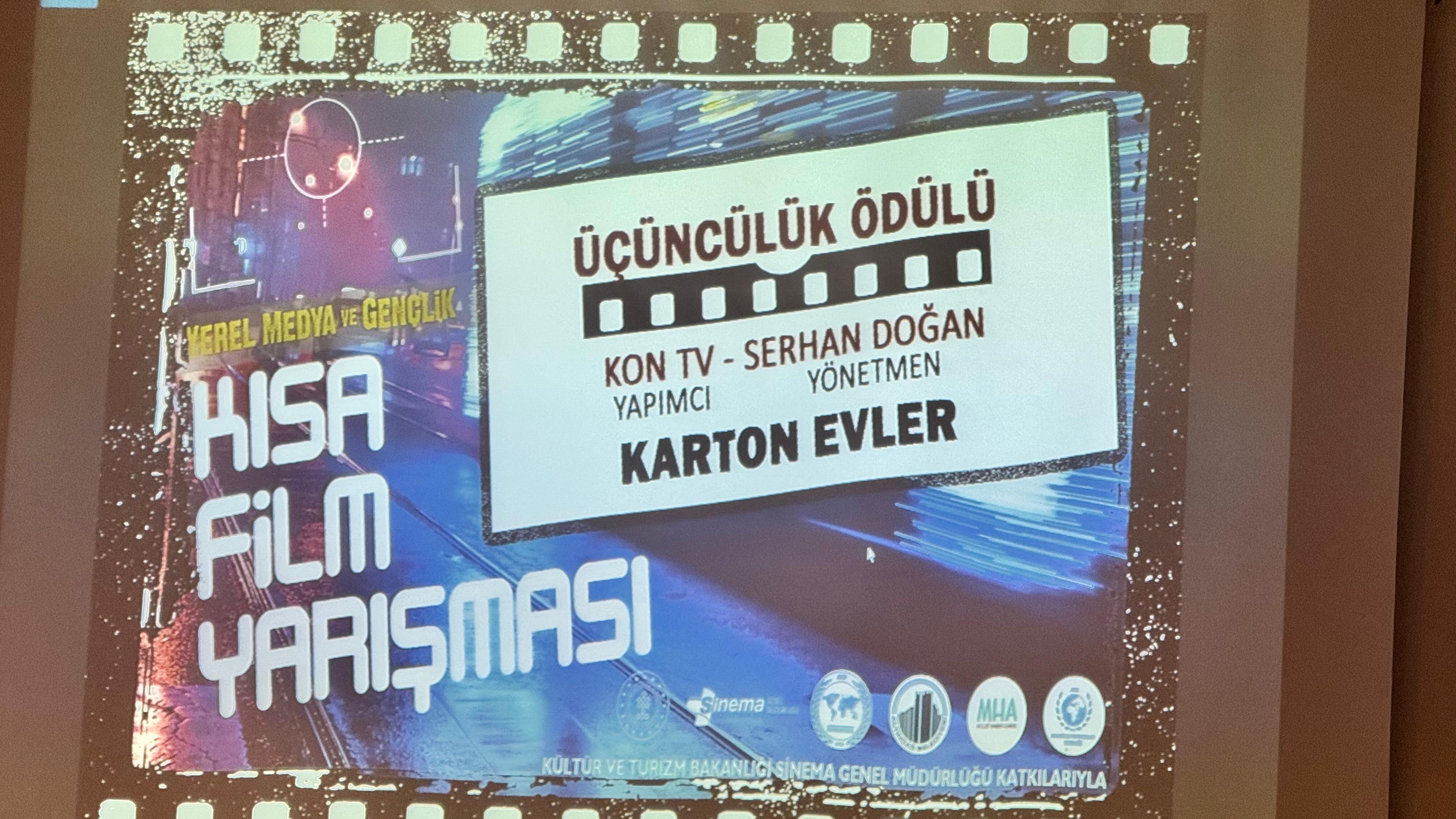 Kısa film Yarışmasının üçüncülük ödülünü, bir kağıt toplayıcısının hayatından kesitler ve sosyal içerikli mesajlar verilen Kon TV yapımcılığında senaryosunu Serhan Doğan’ın yazdığı, Yönetmenliğini Esad Yakıcı’nın yaptığı “Karton Evler” kısa filmi kazandı. Üçüncülük ödülü olarak katılımcıya 30 Bin TL ödül takdim edildi.