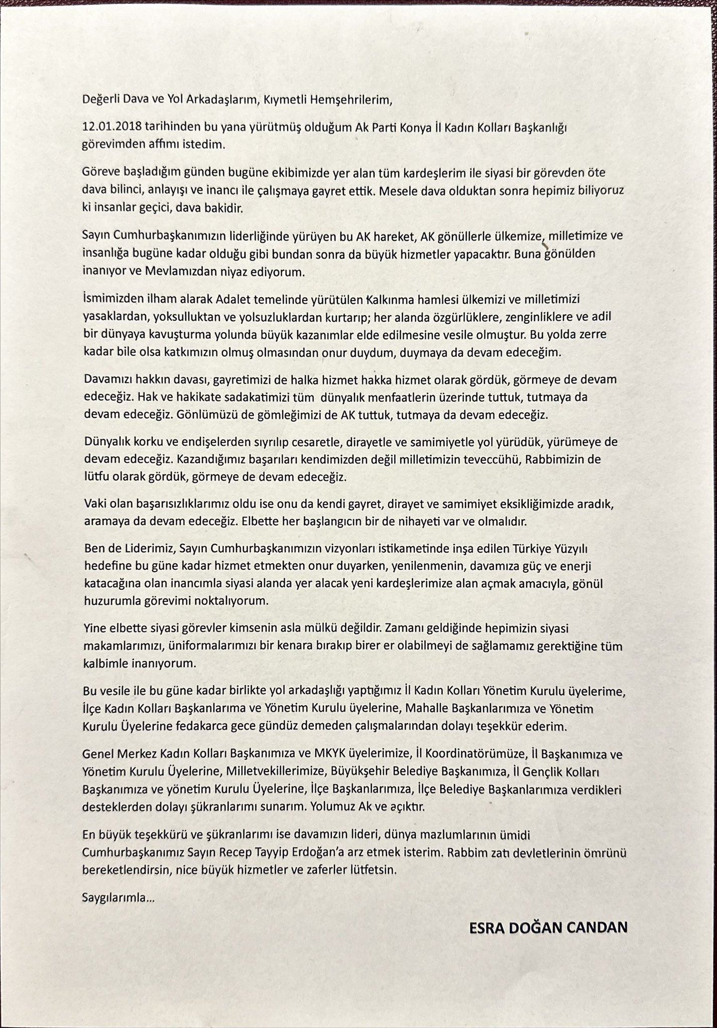 "Değerli Dava ve Yol Arkadaşlarım, Kıymetli Hemşehrilerim, 12.01.2018 tarihinden bu yana yürütmüş olduğum Ak Parti Konya İl Kadın Kolları Başkanlığı görevimden affımı istedim. Dünya lideri Sn Cumhurbaşkanımız Recep Tayyip Erdoğan'a şükranlarımı sunarım" dedi.