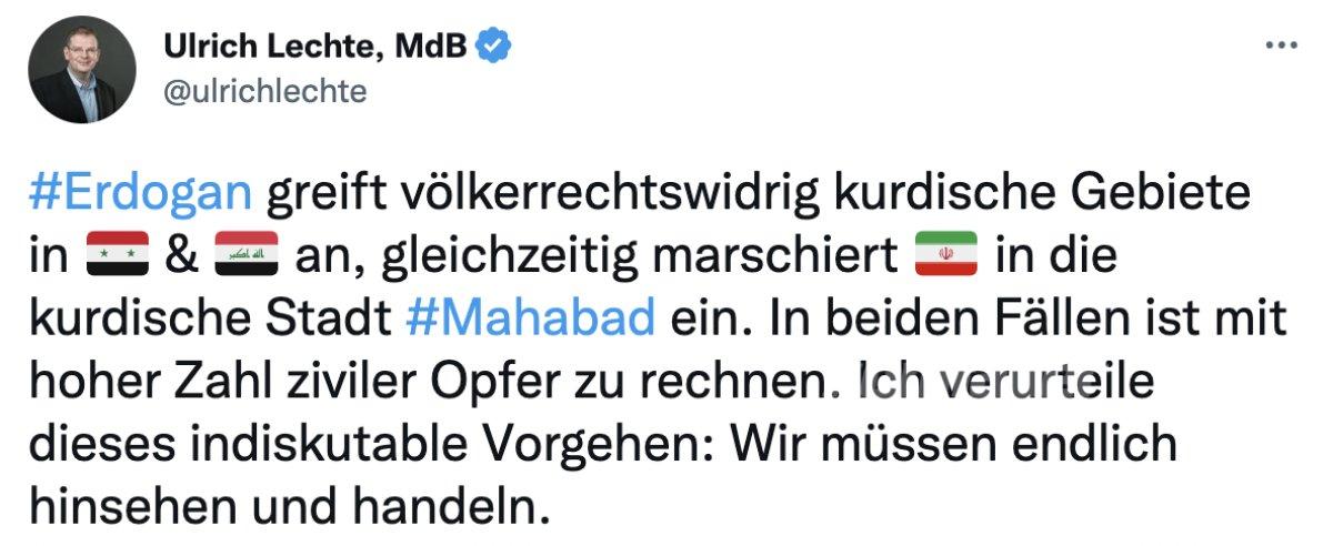 Sosyal Demokrat Parti (SPD), Yeşiller ve Hür Demokrat Parti'den (FDP) oluşan koalisyon hükümetinin küçük ortağı FDP'nin Dış Politika Sözcüsü Ulrich Lechte, Twitter'den yaptığı açıklamada, "Erdoğan devletler hukukunu ihlal ederek Suriye ve Irak'taki Kürt bölgelerine saldırıyor, aynı zamanda İran da Kürt kenti Mahabad'a giriyor. Her iki durumda da çok sayıda sivil kurban verildiğini hesaba katmak gerekir. Bu tartışmaya açık olmayan tutumu kınıyorum. Artık nihayet oraya bakmalı ve harekete geçmeliyiz." dedi.