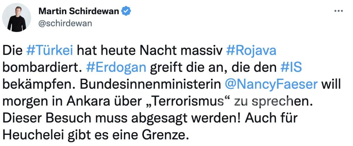 Schirdewan, "Türkiye bu gece ağır şekilde Rojava'yı bombaladı. Erdoğan, İslam Devleti (IŞİD) ile savaşanlara saldırıyor. İçişleri Bakanı Nancy Feaser yarın Ankara'da terörizm konusunda konuşmak istiyor. Bu ziyaret iptal edilmeli. İki yüzlülüğün de bir sınır var!" ifadelerini kullandı.