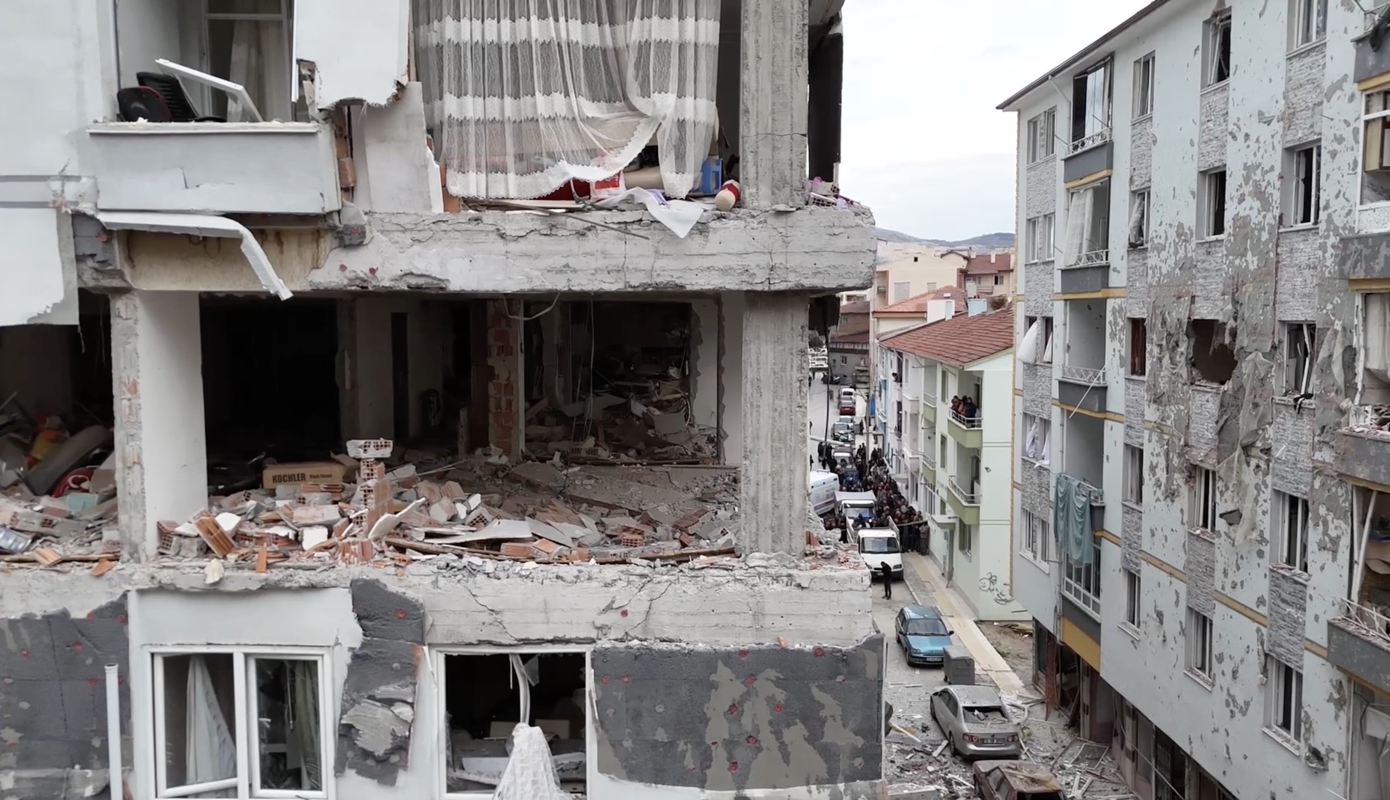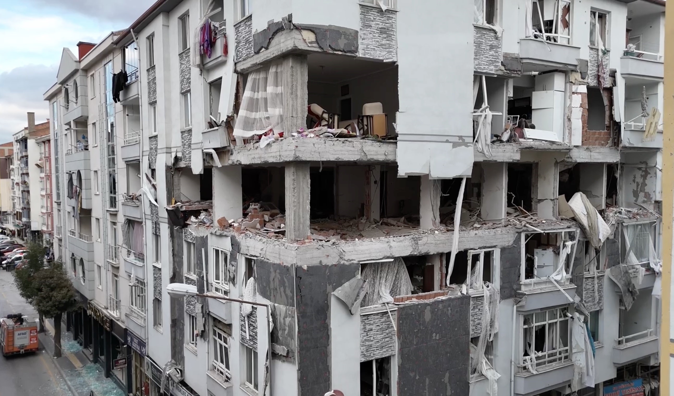 Çorum'da doğalgaz patlamasının yaşandığı bina dron ile havadan görüntülendi.