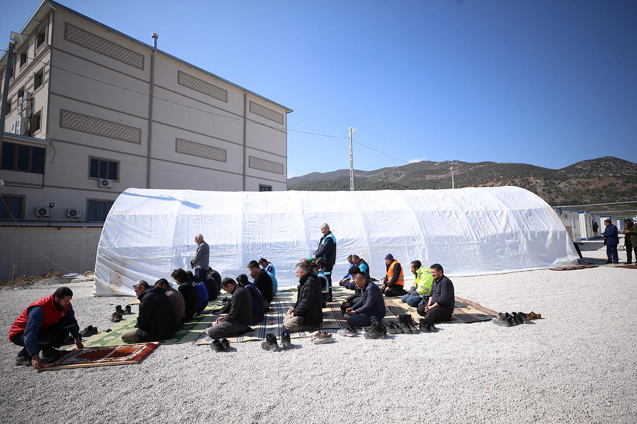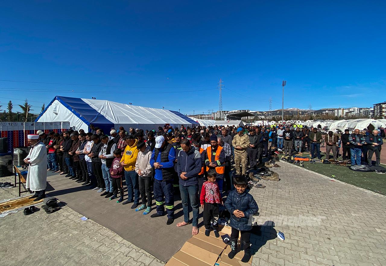 Depremin 3'üncü haftasında cuma namazı için harekete geçen afetzedeler ve yardım için bölgede olan vatandaşlar, yıkılan camilerin avlusunda ve çadır kentlerde saf tuttu.