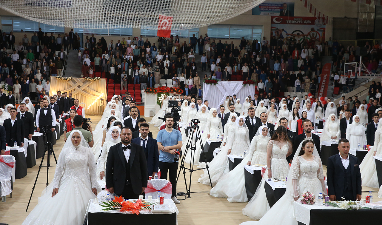 Geçtiğimiz yıl ilk toplu düğün töreninin Hatay’da yapılmasının ardından ikinci toplu düğün organizasyonu Kahramanmaraş Merkez Spor Kompleksinde gerçekleşti.