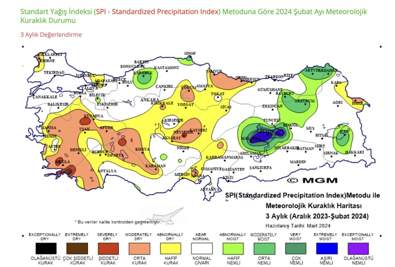 Çevre, Şehircilik ve İklim Değişikliği Bakanlığı'na bağlı Meteoroloji Genel Müdürlüğü'nün (MGM) normalin yüzdesi metoduna göre oluşturduğu, 2024 Şubat ayı meteorolojik kuraklık durumu haritası da Türkiye'deki kuraklık boyutunu gözler önüne serdi.