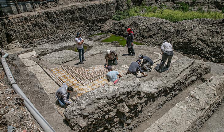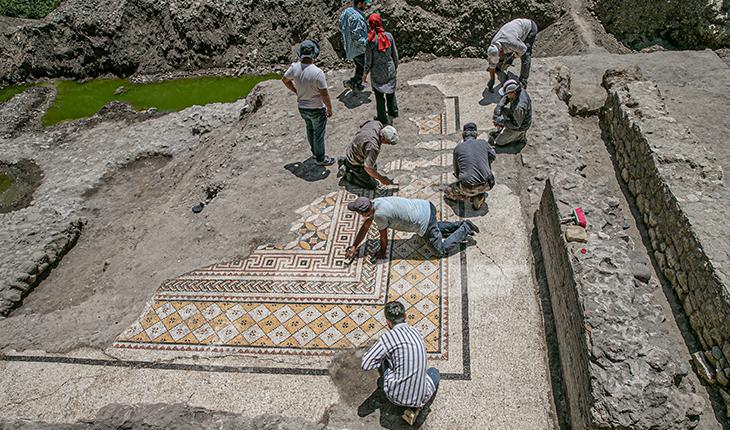 Arkeologlar tarafından alanda yapılan incelemede, kalıntıların Roma dönemine ait bir villanın duvarı olduğu ve tabanında da geometrik bezemeli taban mozaiğinin yer aldığı tespit edildi.
