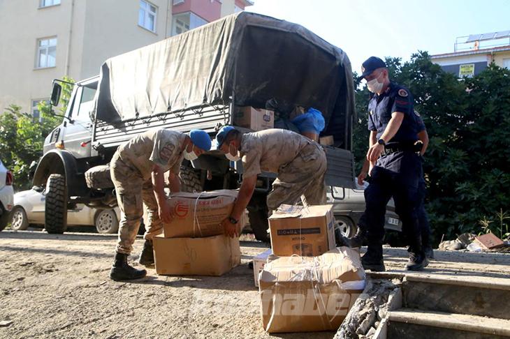 Sel felaketinin yaşandığı Kastamonu'nun Bozkurt ilçesinde jandarma selden etkilenen ve eşyalarını taşımak isteyen vatandaşlara yardım ediyor.