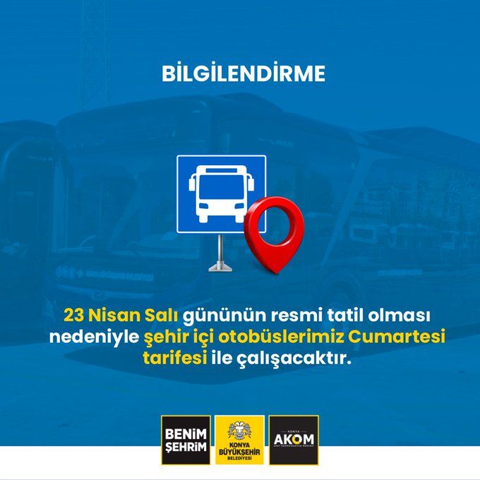 Konya Akom sosyal medya hesabından şu ifadelere yer verdi:"23 Nisan Salı gününün resmi tatil olması nedeniyle şehir içi otobüslerimiz Cumartesi tarifesi ile çalışacaktır." (Yunus Köroğlu)