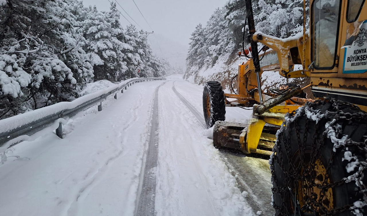 Konya Büyükşehir Belediyesi, kar yağışının etkili olduğu ilçelerde kar temizleme ve yol açma çalışmalarına devam ediyor.