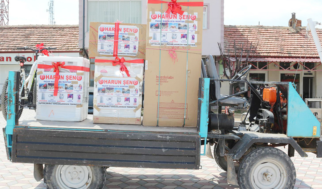Pazar Mahallesi muhtarı seçilen Harun Şen, 31 Mart Mahalli İdareler Seçimi'nde seçmenlerine verdiği hediye sözlerine istinaden çekiliş yaptı. Şen, kura ile belirlenen eşya ve seyahat gibi hediyeleri, mahallesindeki seçmenlerine dağıttı.