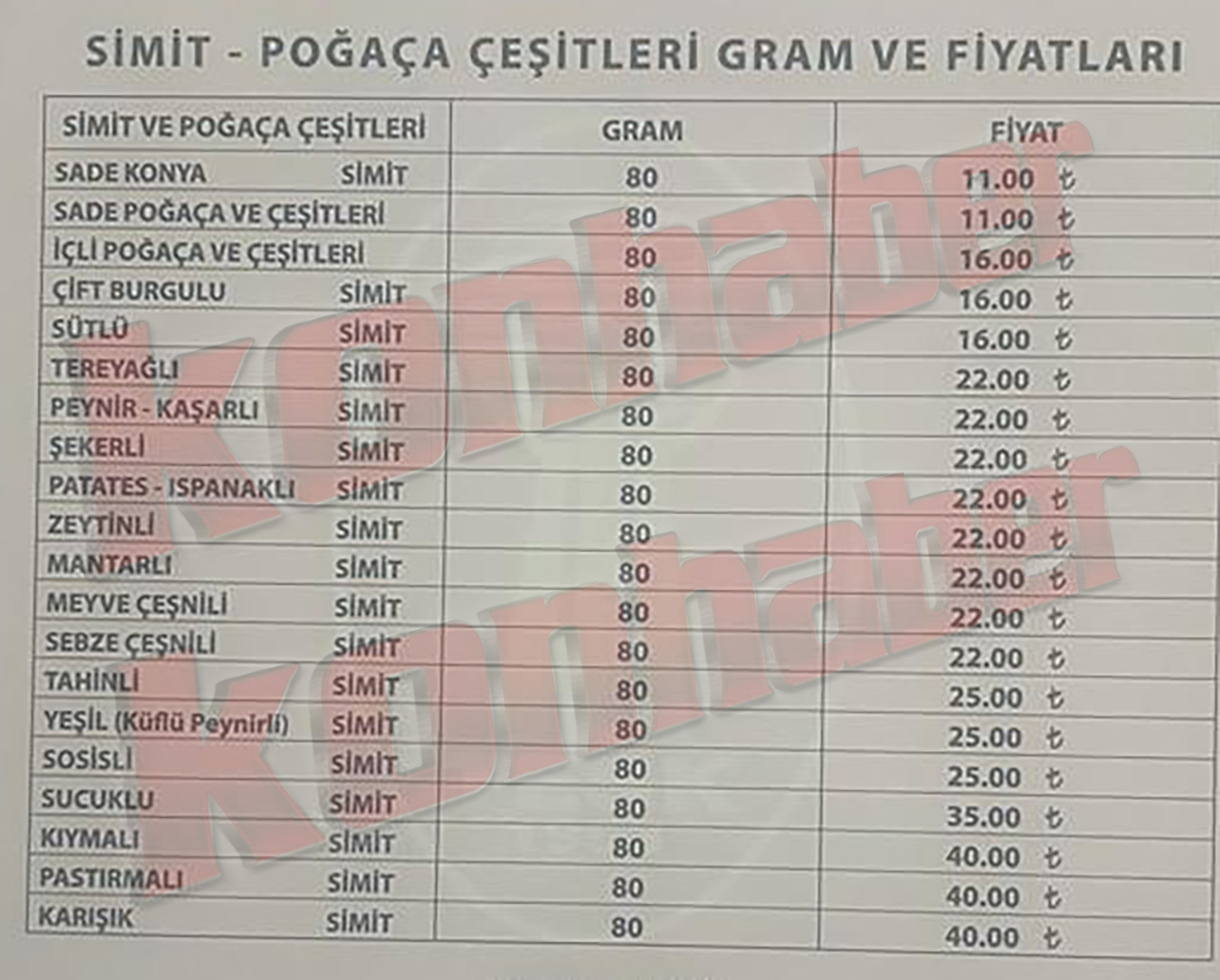 Konya simidi olarak bilinen sade simidin fiyatı yeni zamla birlikte 9 liradan 11 liraya yükseltildi. Tereyağlı simit ise 22 lira oldu. Çift burgulu simit 16 lira, sütlü simit 16 lira; peynirli, kaşarlı, şekerli, patatesli, ıspanaklı, zeytinli, mantarlı, meyve çeşnili ve sebze çeşnili simit 22 lira; tahinli, küflü peynirli ve sosisli simit 25 lira, sucuklu simit 35 lira; kıymalı, pastırmalı ve karışık simit ise 40 lira oldu.
