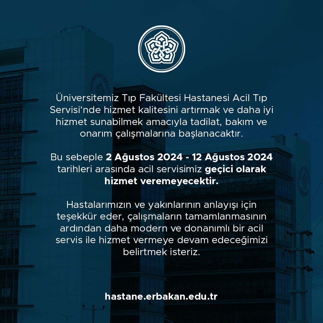 Konuyla ilgili Necmettin Erbakan Üniversitesi’nden yapılan açıklamada,” Üniversitemiz Tıp Fakültesi Hastanesi Acil Tıp Servisi’nde hizmet kalitesini artırmak ve daha iyi hizmet sunabilmek amacıyla tadilat, bakım ve onarım çalışmalarına başlanacaktır. Bu sebeple 2 Ağustos 2024 - 12 Ağustos 2024 tarihleri arasında acil servisimiz geçici olarak hizmet veremeyecektir. Hastalarımızın ve yakınlarının anlayışı için teşekkür eder, çalışmaların tamamlanmasının ardından daha modern ve donanımlı bir acil servis ile hizmet vermeye devam edeceğimizi belirtmek isteriz” denildi.