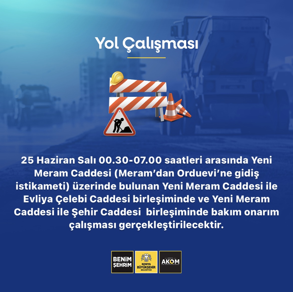 Konya AKOM’dan yapılan duyuruya göre 25 Haziran Salı günü 00:30-07.00 saatleri arasında Yeni Meram Caddesi (Meram’dan Orduevi’ne gidiş istikameti) üzerinde bulunan Yeni Meram Caddesi ile Evliya Çelebi Caddesi birleşiminde ve Yeni Meram Caddesi ile Şehir Caddesi birleşiminde bakım onarım çalışması yapılacağı aktarıldı.