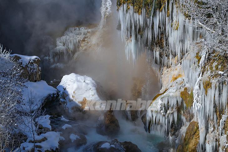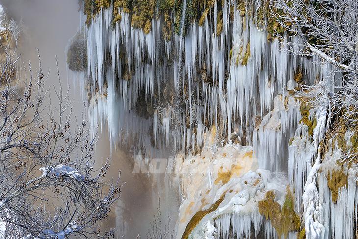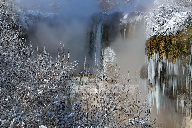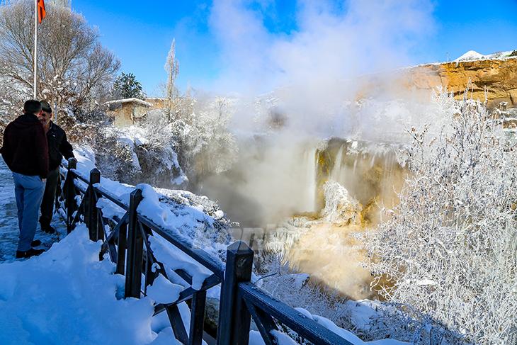 Hava sıcaklığının mevsim normallerinin altında seyretmesi nedeniyle şelalede oluşan buz sarkıtları ve su buharı görsel şölen sunuyor.