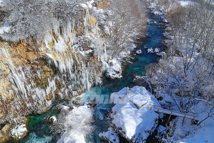 Kent merkezine 100 kilometre mesafedeki Aladağ bölgesinde Göksu Nehri üzerinde bulunan Yerköprü Şelalesi, son günlerde etkili olan kar yağışıyla beyaza büründü.