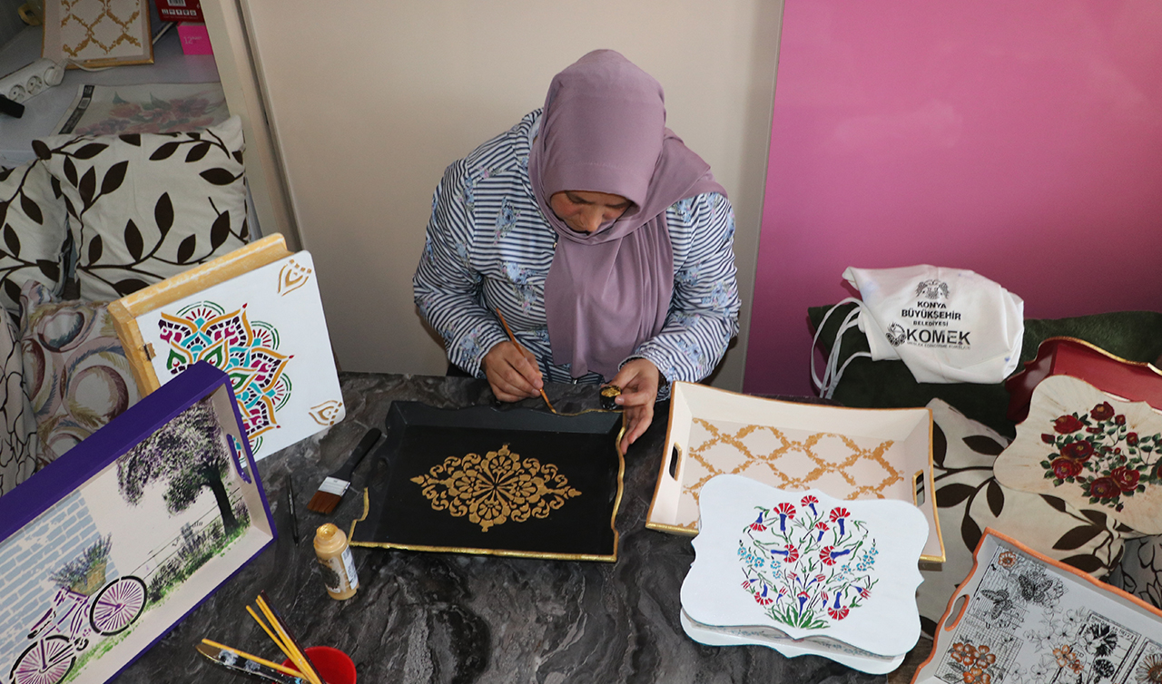 Konya Konteyner Kent 3'üncü etapta kalan 2 çocuk annesi Fatma Yılmaz (35) da tamamladığı ahşap boyama kursu sayesinde kendisini geliştirerek, çeşitli ürünler yapmaya başladığını ifade etti.