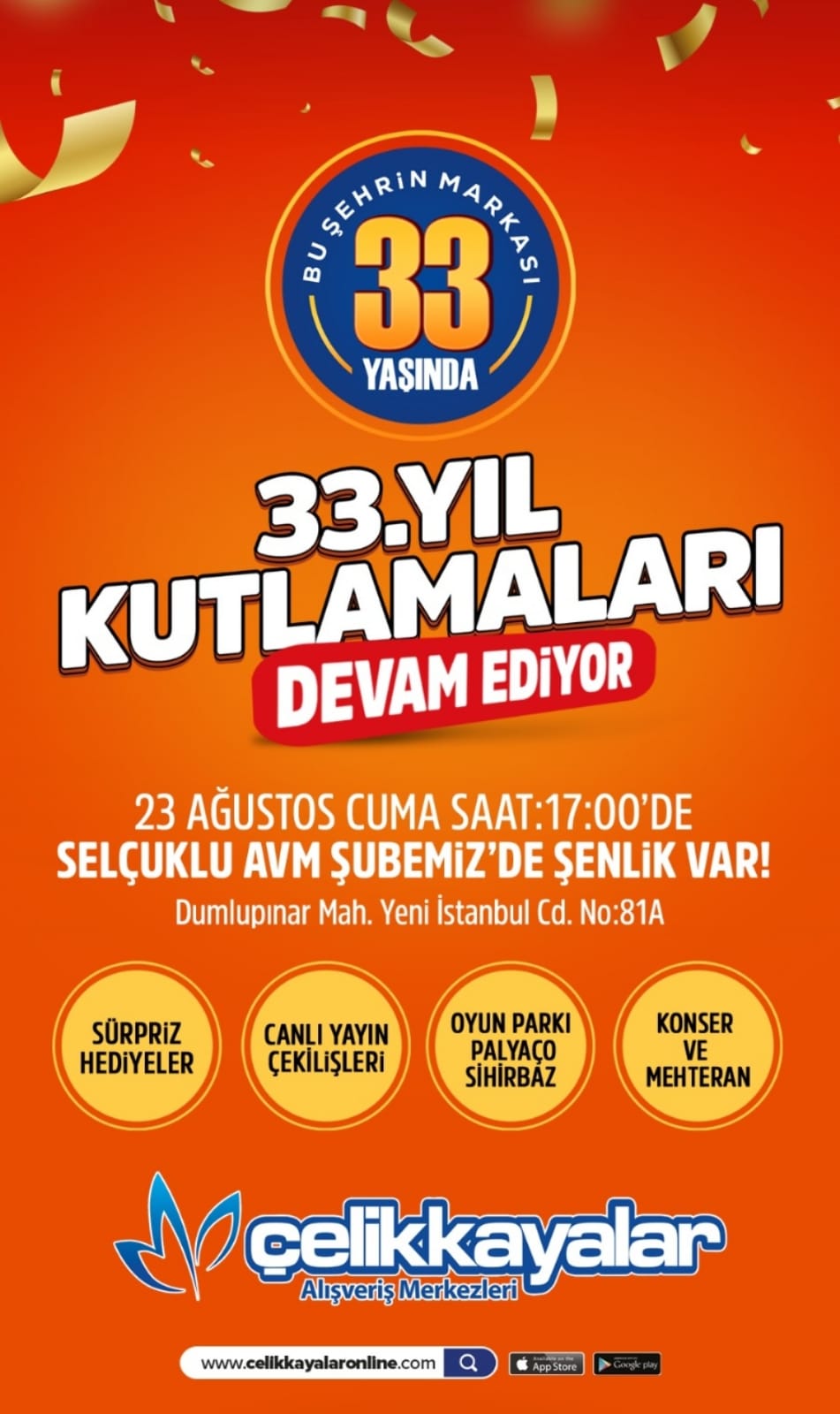 Çelikkayalar kuruluşunun 33.yılını kutlamaya devam ediyor. Bu kapsamda Selçuklu AVM Şubesinde her yaşa özel etkinlikleriyle Konyalıları ağırladı.