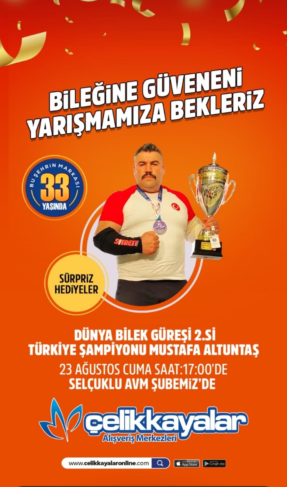 Konya'nın yerel marketler zinciri olan Çelikkayalar 33.yılına özel etkinlikler ve indirimlere devam ediyor. Bu kapsamda Dünya Bilek Güreşi 2.'si Türkiye Şampiyonu Mustafa Altuntaş'ta Çelikkayalar Selçuklu AVM Şubesi'ne geldi.