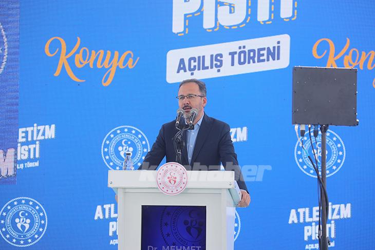 KONYA, TÜRKİYE’DEKİ SPOR DEVRİMİNİN EN YAKIN ŞAHİDİ“Bugün Konya’mızda prestijli tesislerimizden birini daha milletimizle, spor camiamızla, halkımızla buluşturacağız.” diye devam eden Bakan Kasapoğlu, “Uluslararası standartlardaki atletizm pistimizle bu çıta bir adım daha yükselmiş olacak. Konya’mızın çok kıymetli gençlerine, sporcularına ve tüm halkımıza hayırlı, uğurlu olsun diyorum. Tabii ki bu yatırımlar millete efendi değil, hizmetkar olmak üzere yola revan olan bir gönül insanının liderliğinde gerçekleşen pek çok alandaki devrimlerden biri olan spor devriminin en güzel en yakın yansımasıdır. Bu devrimin en yakın şahitlerinden biri de bu devasa bir spor vadisindeyiz. Bir tarafta atletizm pistimiz, diğer tarafta dünyanın en modern stadyumlarından birisi, diğer yanda olimpik havuzumuz ve veledromumuz. İşte bu devrim somut bir şekilde Konya’nın şahitliğinde gerçekleşiyor.” diye konuştu.