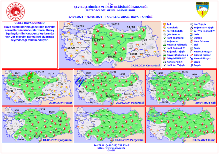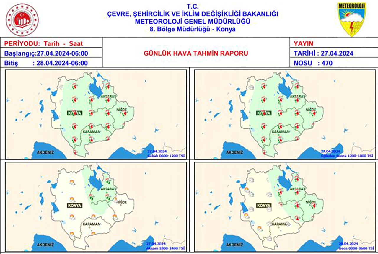 Meteorolojinin son hava tahmin raporuna göre Konya’da havanın bugün (27 Nisan Cumartesi) parçalı ve çok bulutlu, Konya'nın batı kesimleri dışındaki yerlerin (Akşehir, Beyşehir, Çeltik Derbent, Derebucak, Doğanhisar, Hüyük, Tuzlukçu ve Yunak) aralıklı sağanak ve gök gürültülü sağanak yağışlı geçeceği tahmin ediliyor. Hava sıcaklığının 1 ila 3 derece azalması beklenirken, rüzgârın ise genellikle güneyli yönlerden hafif ara sıra orta kuvvette ve yer yer kuvvetlice esmesi bekleniyor.