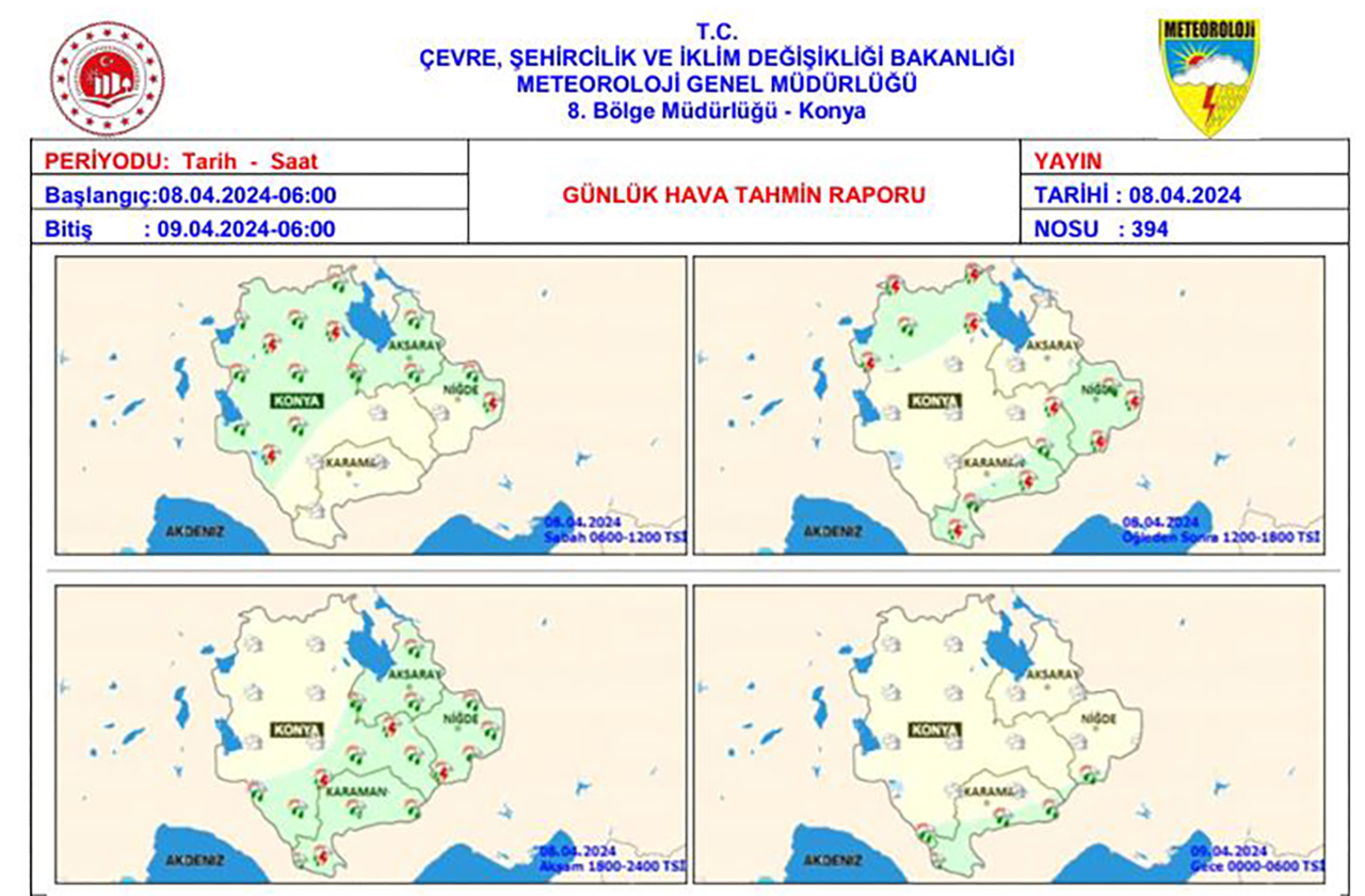 Meteorolojinin son hava tahmin raporuna göre Konya’da havanın bugün (8 Nisan Pazartesi) parçalı ve çok bulutlu, aralıklı sağanak ve gök gürültülü sağanak yağışlı geçeceği tahmin ediliyor. Hava sıcaklığının2 ila 4 derece azalması beklenen kentte rüzgârın ise genellikle kuzeyli yönlerden hafif, ara sıra orta kuvvette ve yer yer kuvvetlice esmesi bekleniyor.