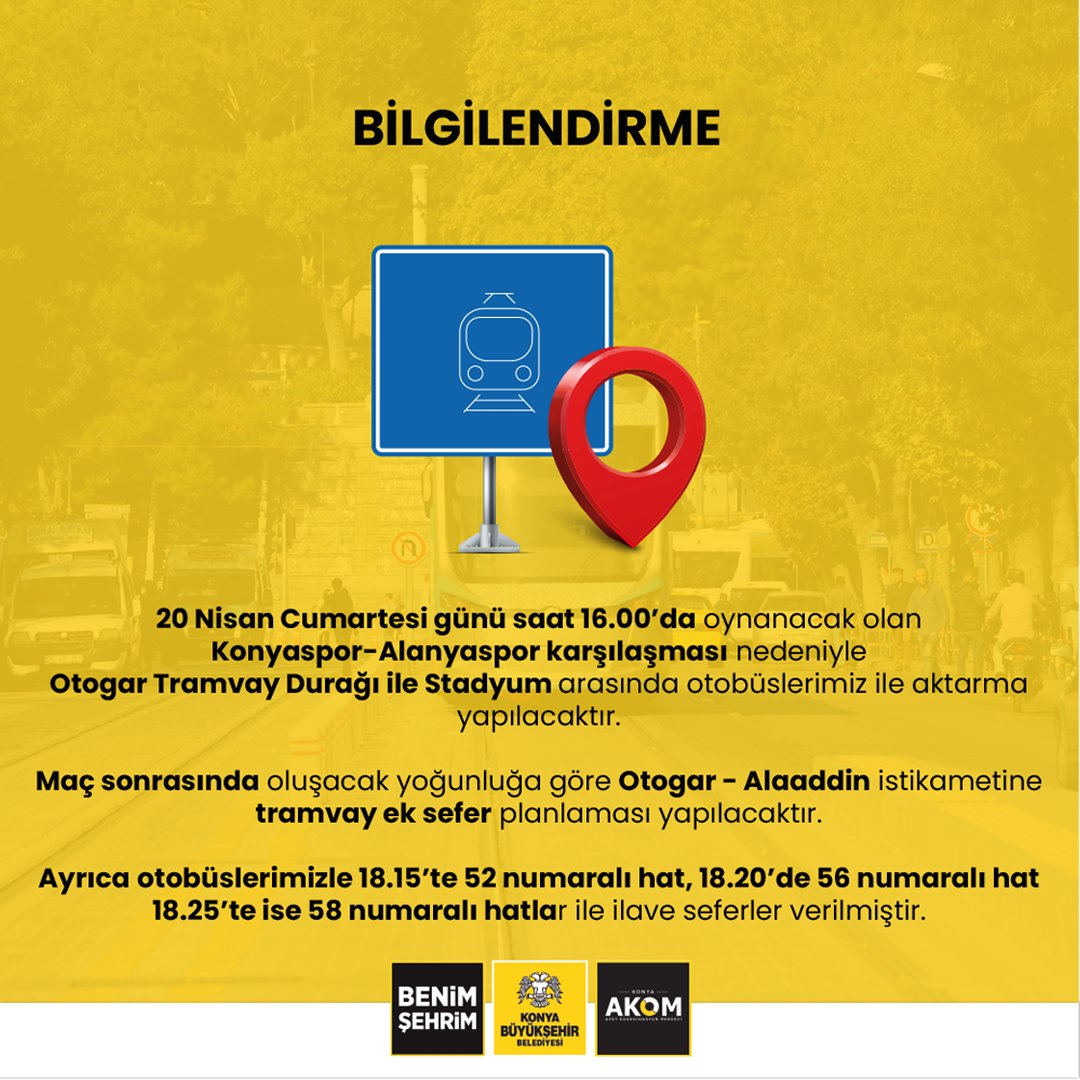 Konuyla ilgili Konya AKOM (Afet Koordinasyon Merkezi) tarafından yapılan açıklamada, “ Gün içinde oynanacak olan Konyaspor - Alanyaspor maçı öncesi ve sonrasında olumsuz hava şartlarından taraftarlarımızın etkilenmemesi adına, Otogar - Alaaddin istikametine ek sefer planlaması yapılmıştır. Tramvay, ek sefer olarak Cumhuriyet - Alaaddin istikametine çıkış yapacaktır. Maç öncesi ve sonrası Otogar tramvay durağı ile Stadyum arası otobüsler ile aktarma yapılacaktır. Ayrıca maç sonuna: 18.15 - 52 nolu hat, 18.20 - 56 nolu hat, 18.25 - 58 nolu hat İlave seferler verilmiştir” denildi.