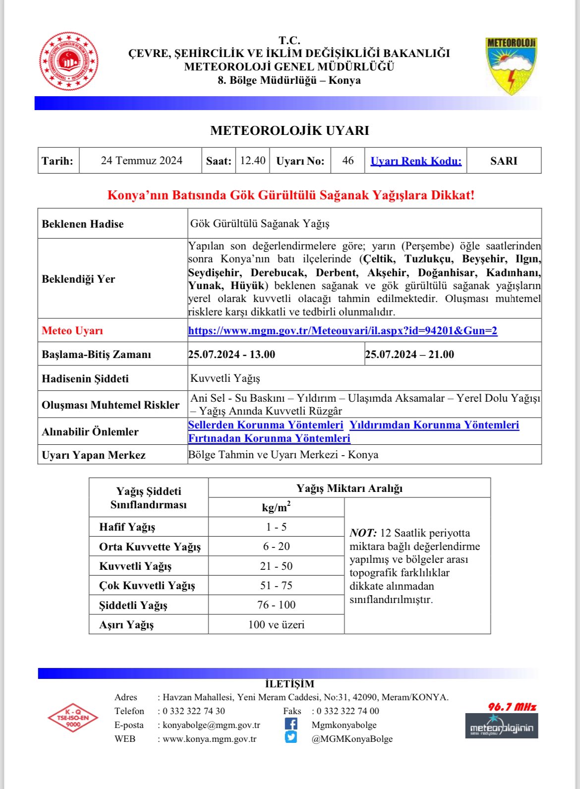 Buna göre akşam saat 21.00'a kadar Konya'nın batı ilçelerinde (Çeltik, Tuzlukçu, Beyşehir, Ilgın, Seydişehir, Derebucak, Derbent, Akşehir, Doğanhisar, Kadınhanı, Yunak, Hüyük) ani sel, su baskını, yıldırım, ulaşımda aksamalar, yerel dolu yağışı, yağış anında kuvvetli rüzgar gibi oluşması muhtemel temel risklere karşı uyarıda bulunuldu.