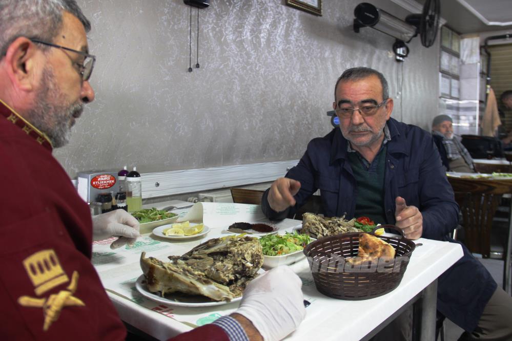 Özenle hazırlanan kuzu kellenin pişirilmesinin ardından tüketildiğini belirten Ortaabacı, “Fırında kızarttığımız kuzu kellemiz bu şekilde kelle olarak yenir. Bunun çorbası da yapılıyor, o ayrı bir lezzet, bunun müşterileri ayrı, bunun lezzeti ayrı. Bu pişirilen kelleler yarım ve tüm olarak kırılıyor. Yanında kimyon, kekik, karabiber ve pul biberle sadece fırın kebabı yer gibi dili, beyni, yanağı ve gözü olarak yenir. Bunun soğuğu söğüş olarak yapılır ama biz babam babasından, ben de babamdan bu şeklide gördüm ve üçüncü kuşak olduğum için onlarda gördüğümüz bu şekilde. Fırında pişirip su buharında servise sunuyoruz. Bu kelleyi fırınla işimizi bitirdikten sonra akşama kalan köz ile pişiriyoruz. Gece pişiriyoruz kelleleri, çünkü gündüz fırın alevli olduğu için pişmez” şeklinde konuştu.