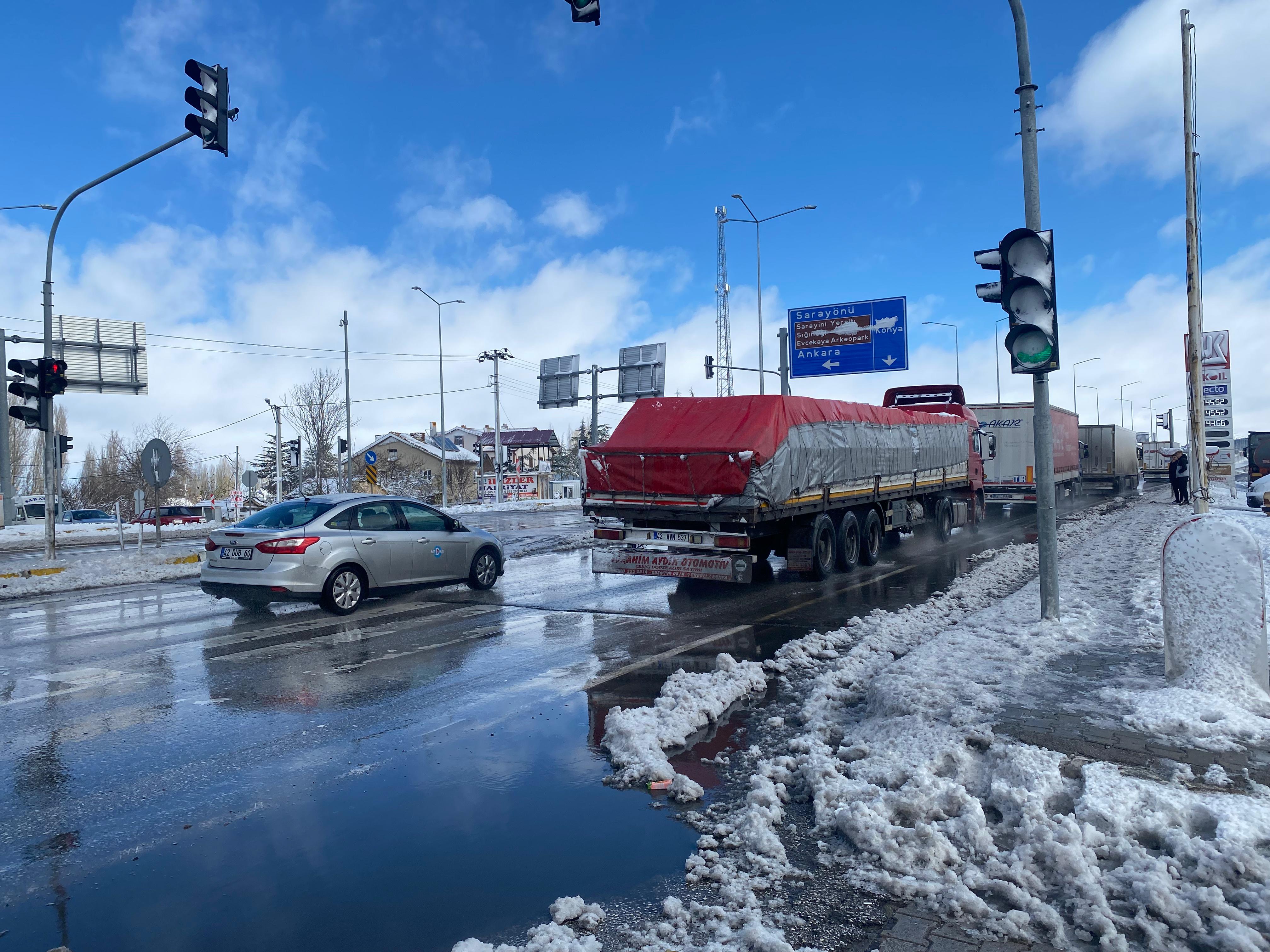 Konya'nın Sarayönü ilçesinde akşam saatlerinde başlayarak etkisini artıran kar yağışı sonrası ilçe beyaza büründü.