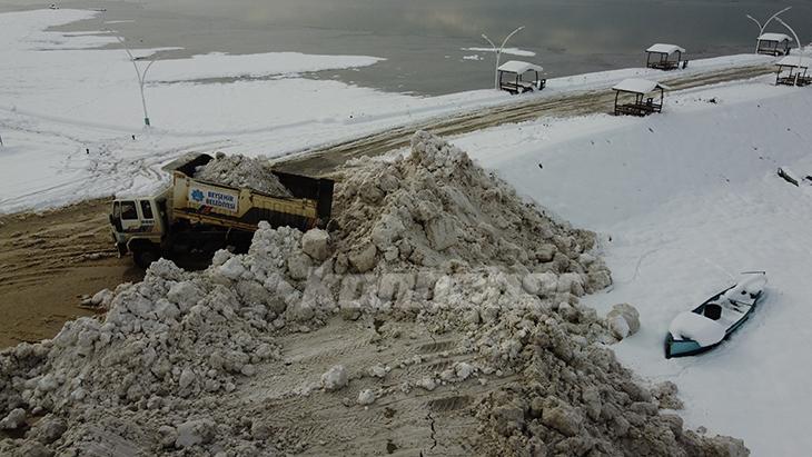 Konya'nın Beyşehir Belediyesi, ilçe merkezinden toplanan karları kamyonlarla kuraklıktan dolayı metrelerce çekilen Beyşehir Gölü'ne döküyor.