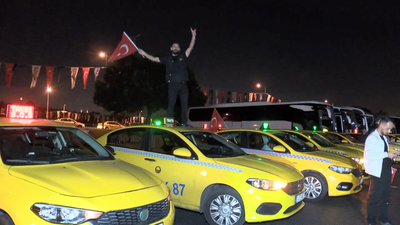 Şişli'de toplanan yüzlerce taksici, araçlarına astıkları Türk bayrakları ile konvoy halinde Yenikapı Etkinlik Alanı'na geldi.