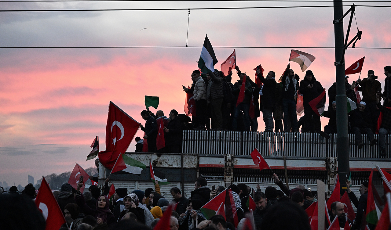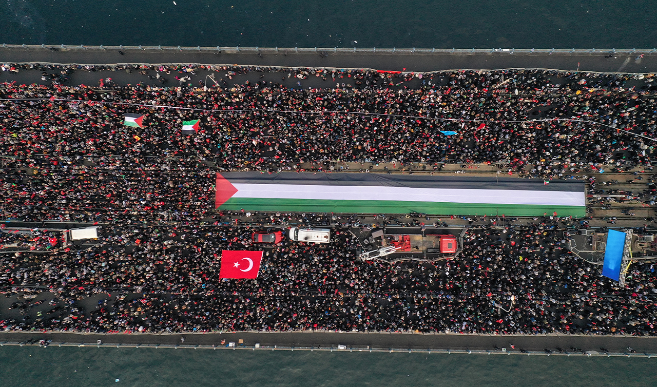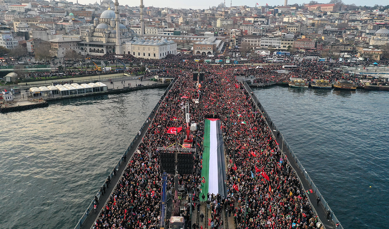 Yeni yılın ilk gününde binlerce kişi hem şehitlerimize rahmet hem de İsrail'in zulmü altında bulunan Filistinli vatandaşlar için, Galata Köprüsü'nde buluştu.