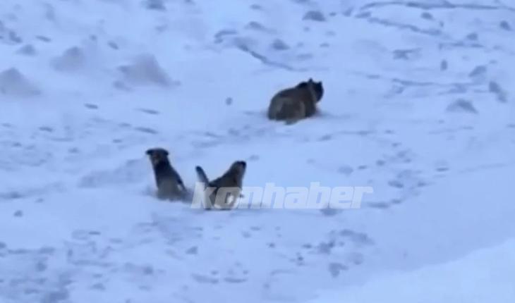 Bu esnada grubun yanında bulunan 2 Kangal köpeği bozayıyı uzaklaştırdı. Bu anlar, dağcı Erdoğan Çiçek tarafından görüntülenirken, kara bata çıka kaçan ayı da bir süre sonra gözden kayboldu.
