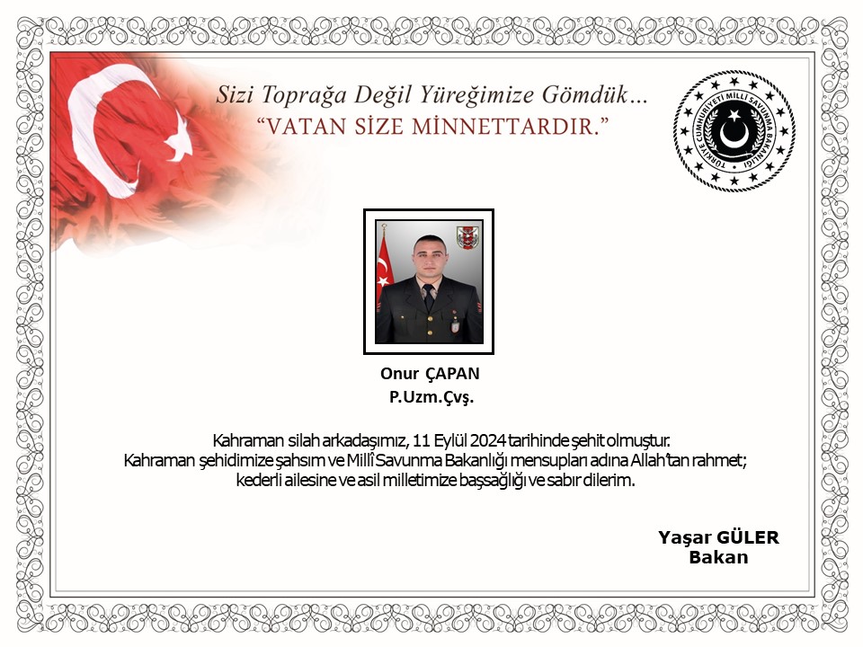 Zeytin Dalı Harekatı bölgesinde, Piyade Uzman Çavuş Onur Çapan, meydana gelen silah kazası sonucu şehit oldu.