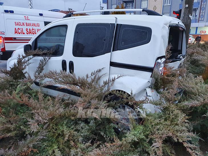 Çarpışmanın etkisiyle hafif ticari araç sürücüsü direksiyon hâkimiyetini kaybedip savrularak orta refüje çıktı.