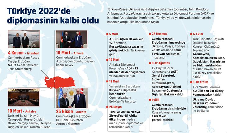 Türkiye-Rusya-Ukrayna üçlü dışişleri bakanları toplantısı, Tahıl Koridoru Anlaşması, Rusya-Ukrayna esir takası, Antalya Diplomasi Forumu (ADF) ve İstanbul Arabuluculuk Konferansı, Türkiye'yi bu yıl dünyada diplomasinin nabzının attığı ülke konumuna taşıdı.