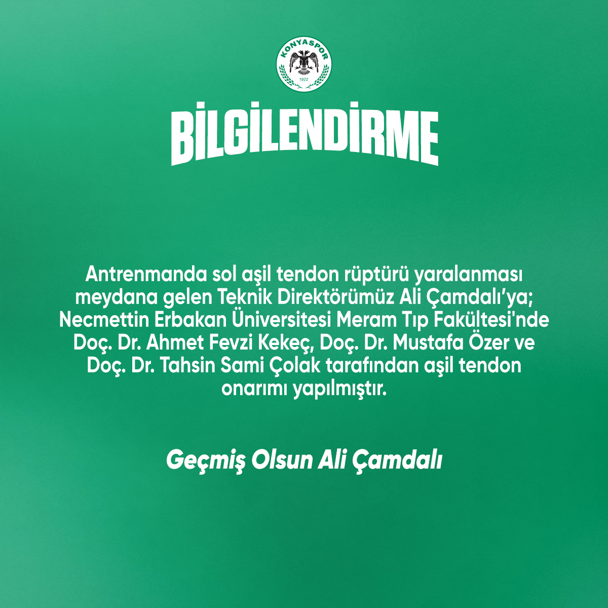 TÜMOSAN Konyaspor'un açıklaması, "Geçmiş Olsun Ali Çamdalı. Antrenmanda sol aşil tendon rüptürü yaralanması meydana gelen Teknik Direktörümüz Ali Çamdalı’ya; Necmettin Erbakan Üniversitesi Meram Tıp Fakültesi'nde Doç. Dr. Ahmet Fevzi Kekeç, Doç. Dr. Mustafa Özer ve Doç. Dr. Tahsin Sami Çolak tarafından aşil tendon onarımı yapılmıştır."