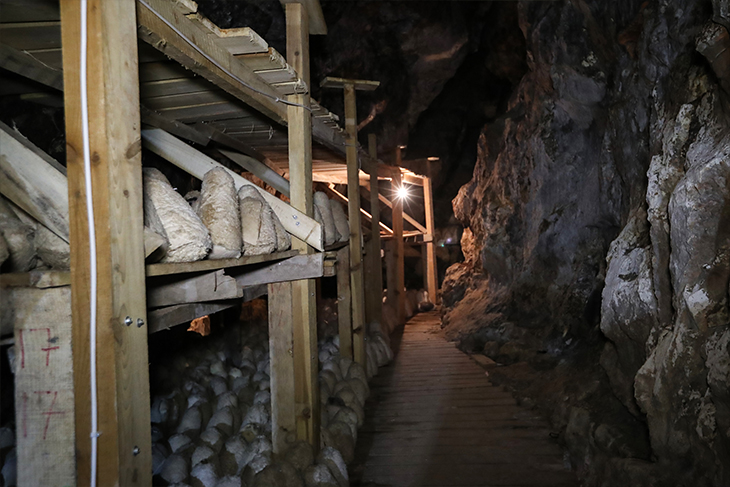 "Burada köylüler, kendi sağdıkları sütlerden geleneksel yöntemle, geleneksel mayayla mayaladıkları peynirleri tulumlara koyuyorlar ve şu anda içinde bulunduğumuz obruk mağarasına getiriyorlar. Yerin 35 metre altında, sürekli 4 derece sıcaklıkta olan bu mağaraya getiriyorlar. 4 ay boyunca bu mağarada bekleyen peynirler artık kıvamına geliyor ve satışa sunuluyor."