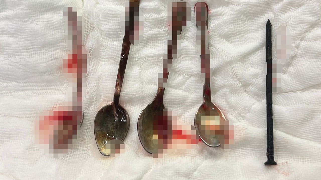 Kayseri'de 15 yaşındaki erkek çocuğunun midesinden, 2 saat süren operasyonla 4 metal tatlı kaşığı ve 1 çivi çıkarıldı.